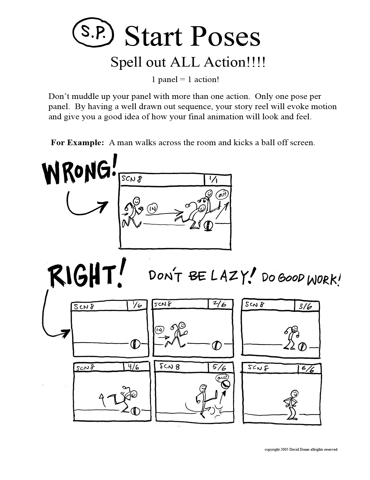 Students are introduced to the "fundamentals" of animation. Regardless of computers or technology, these animation principals are the foundation off ALL animation. Timing, weight, squash/stretch, posing, and character are explored at the basic level. I feel if students can make a ball bounce with all the essential elements, then a human walk can be achieved. Most students want to bypass this and go right into complexity, but they fail to understand that it's the basics that take a life time to understand. Most of the talented animators understand this...even if it's at a intuitive level. |