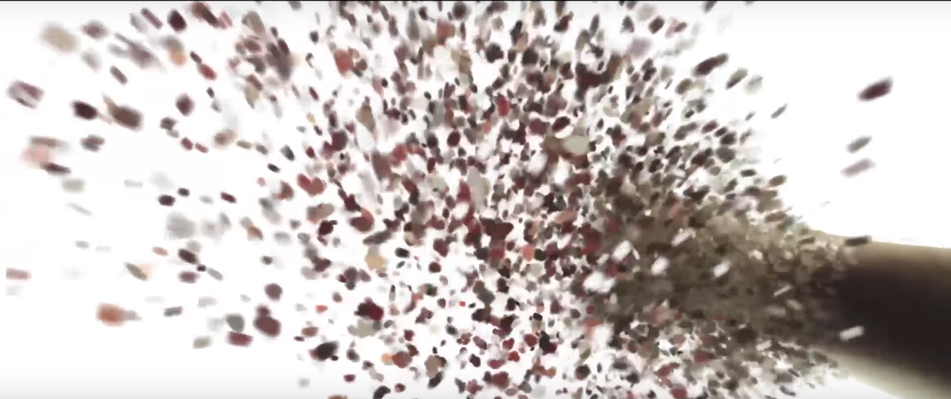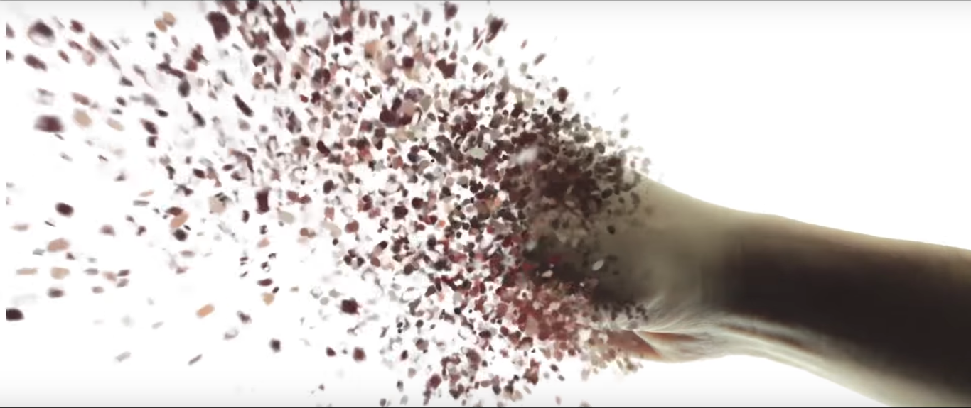 Steps:1) Extract main object in a pure color background image using green screening techniques. 2) Generate the background image by filling with background color. 3) Disintegrate the object. 4) Move, scale, rotate, or do some perspective warping with the "pieces" to make the disintegrated image. 5) Compose the disintegrated image with the background image. |